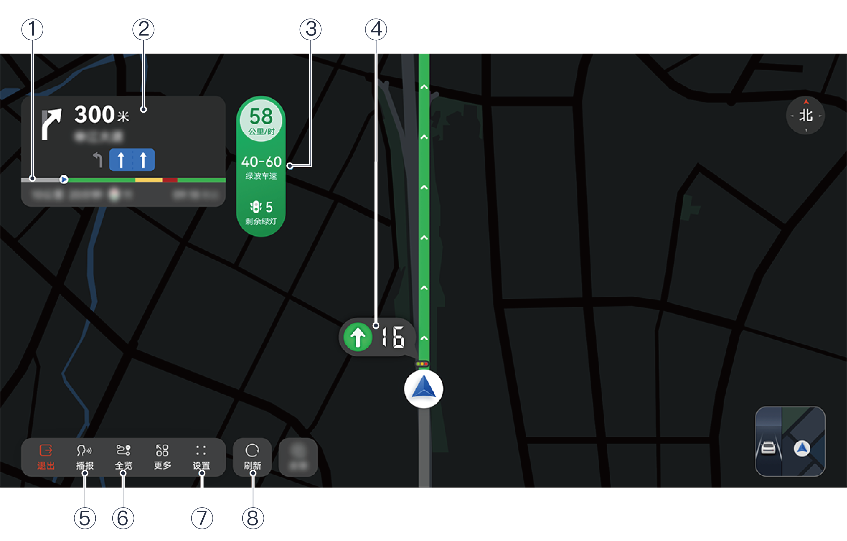 | ② | 导航引导面板 | 可查看前方路口转向图标、到前方路口的距离、下一条道路名、车道引导信息、路况光柱图、剩余行程距离和时间等信息。过路口时,会显示路口放大图,模拟真实路口场景。 |