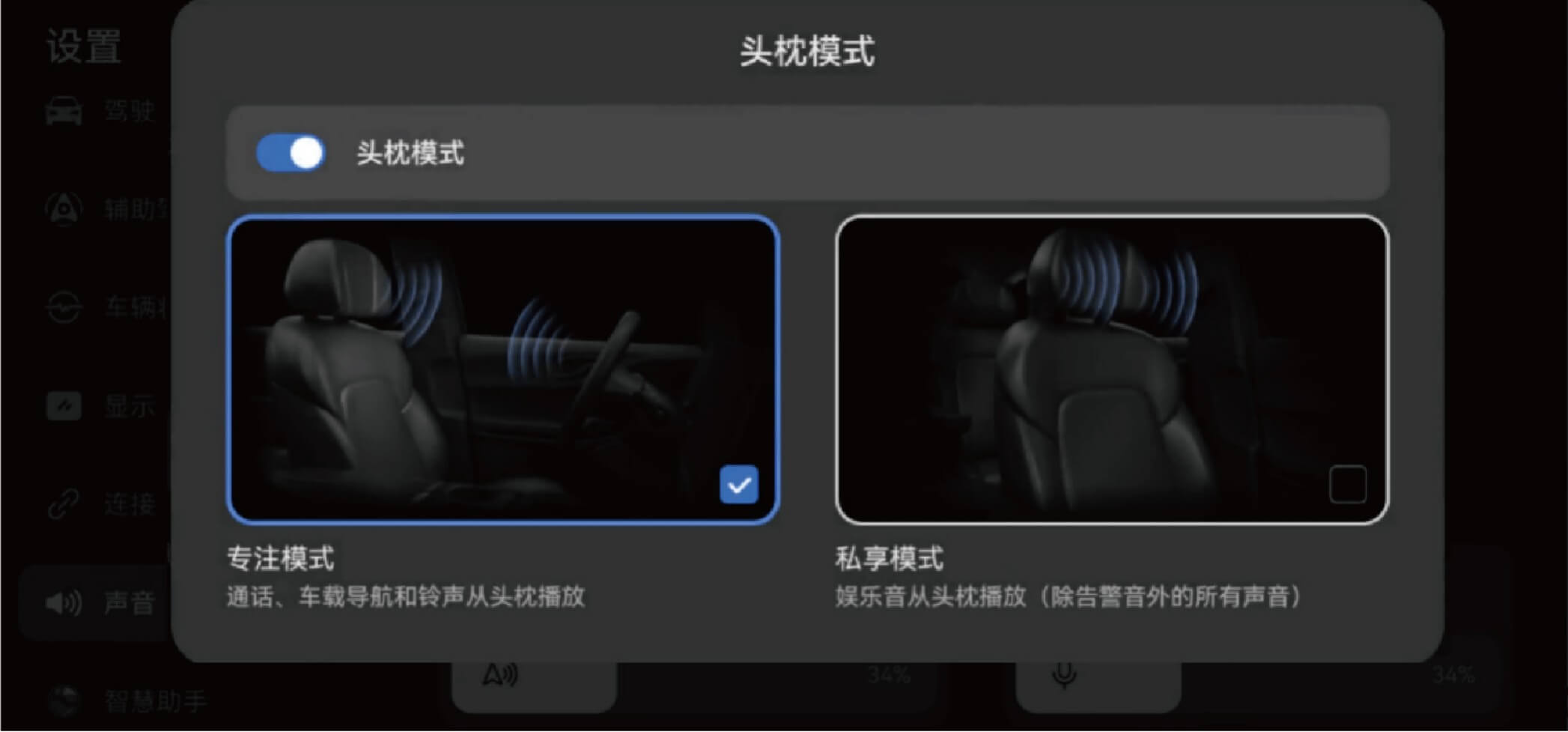 - 在中控屏设置 > 声音界面,开启头枕模式开关。