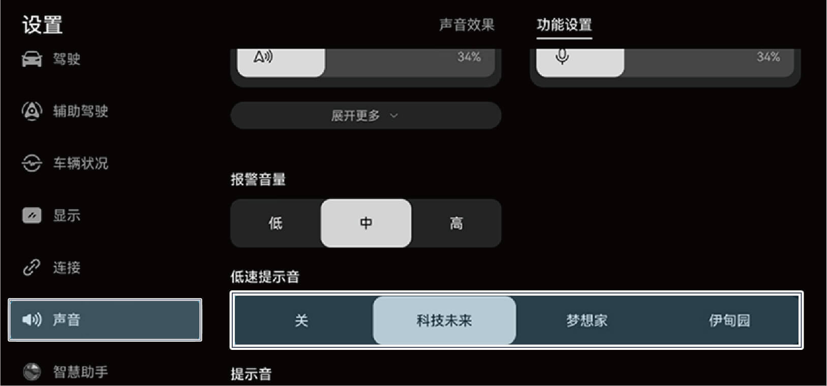 - 因车辆配置存在差异,部分车型仅支持低速提示音的开启或关闭,请以车辆实际情况为准。