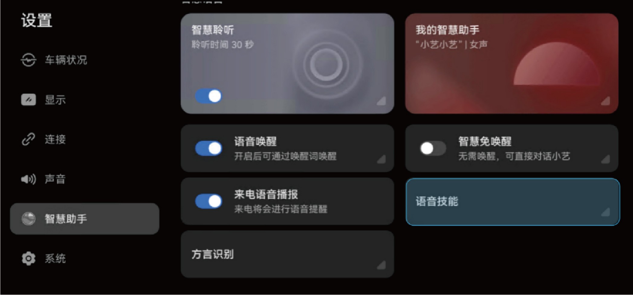 播报音色:点触我的智慧助手,可根据喜好选择官方声音(包括女声、男声、童声、少女声)或自定义声音。自定义声音支持在手机、平板或中控屏录制声音,且需先联网和登录华为账号。