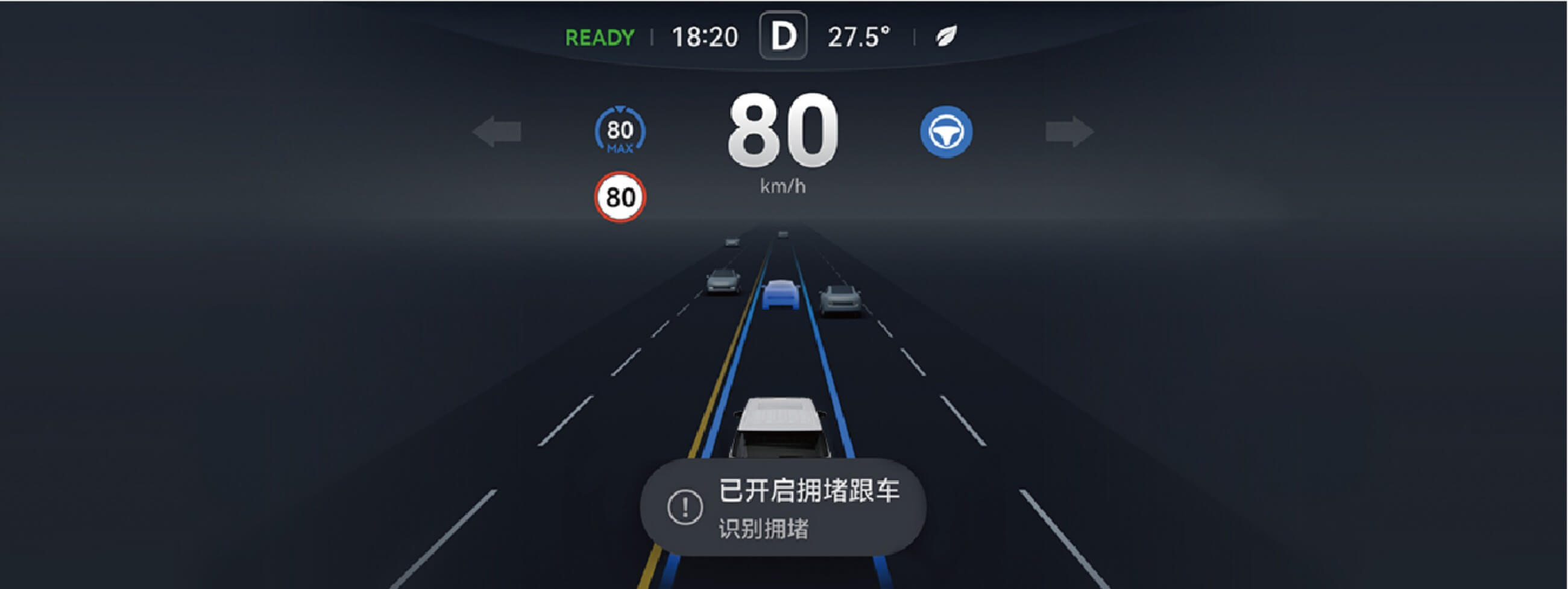 进入拥堵跟车模式时,组合仪表上会显示“已开启拥堵跟车”的提示。该提示会在显示数秒后消失。