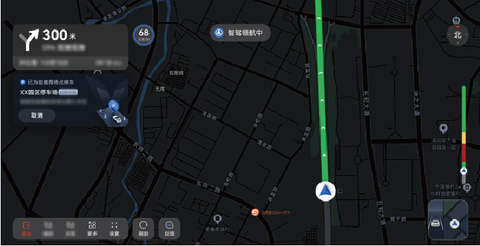 - 智驾领航辅助:辅助驾驶员控制车辆按导航路线在公开道路上行驶,根据机动车交通信号灯信息辅助控制车辆通过常规路口、环岛,并支持智能变道、智能限速等功能。接近目的地时,系统会弹出“已为您推荐终点停车”卡片,提示驾驶员车辆可直达目的地车位。