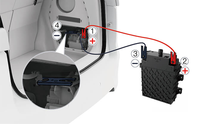 - 将黑色电缆的 ③ 端连接到供电蓄电池的负极(-)上,将黑色电缆另一端 ④ 牢固连接到亏电蓄电池的负极电缆上;