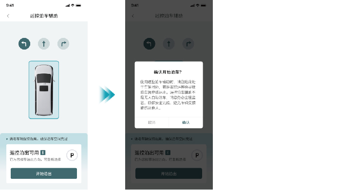在手机界面点触 “遥控泊车辅助”,待系统完成自检后,选择泊出方向,再点触“开始泊出”并确认,一键控制车辆泊出车位。