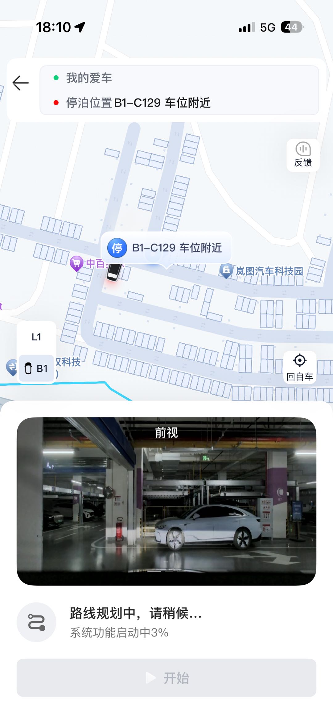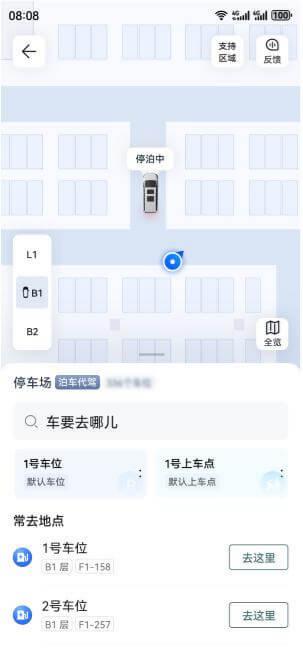 待系统完成泊车代驾条件自检后,手机岚图汽车 APP 显示当前停车场的平面图。
