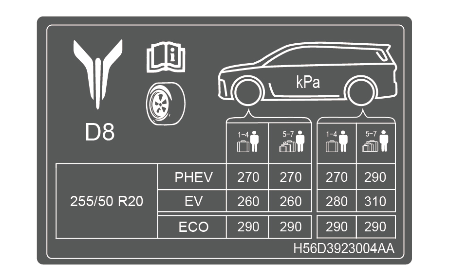 请使用功能良好的胎压检测仪定期检查所有轮胎胎压(建议每月至少检查一次),标准胎压数据标签,粘贴于主驾车门 B 柱位置。