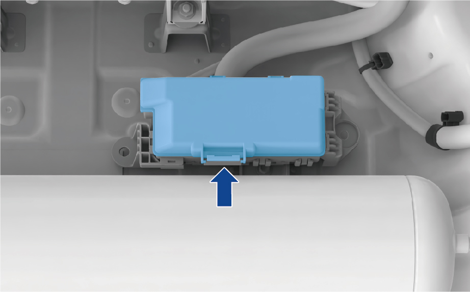 - 沿上图箭头方向按压固定卡扣,打开保险盒盖;