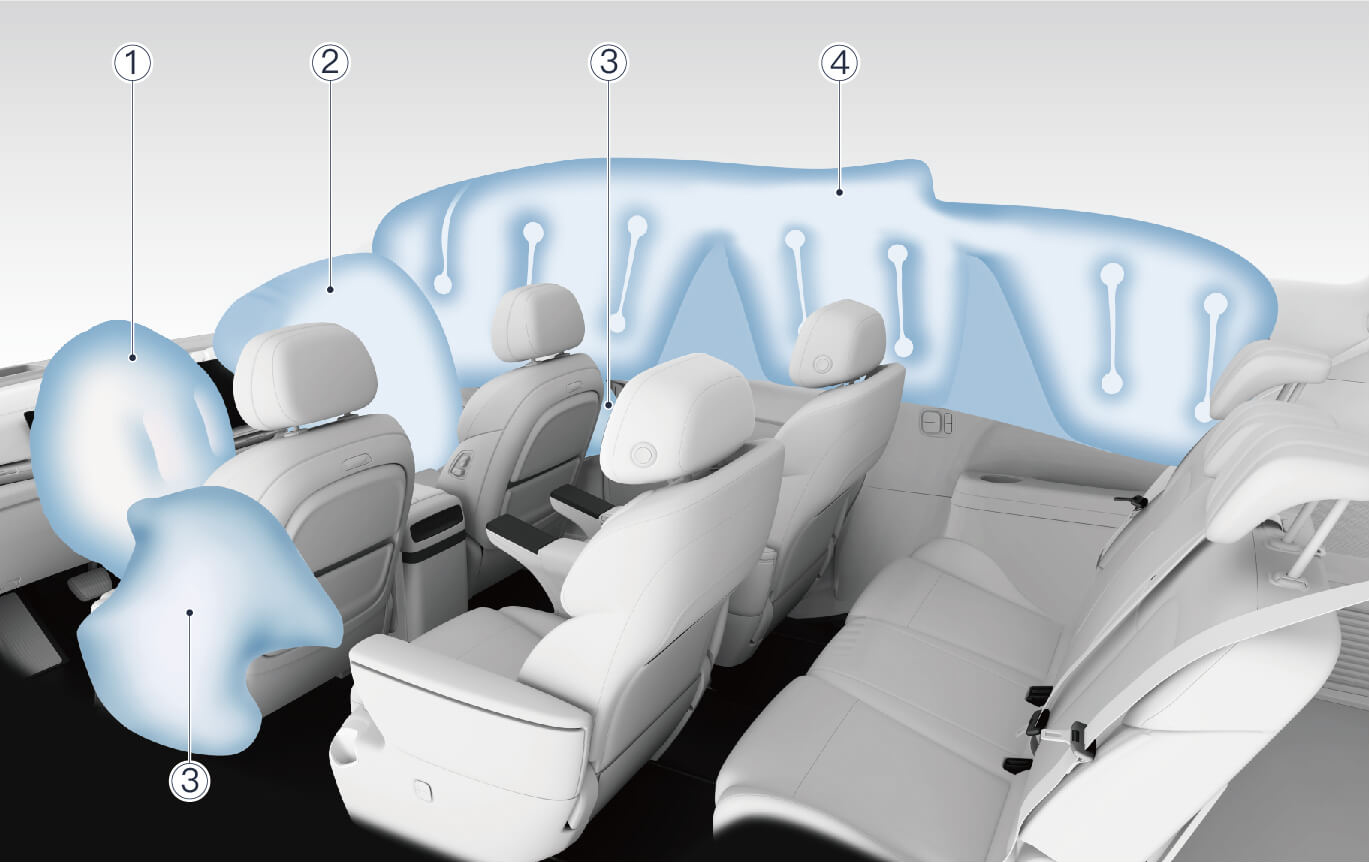| ④ | 侧气帘式气囊(位于两侧车门上方,A 柱到 D 柱的顶棚区域内) |