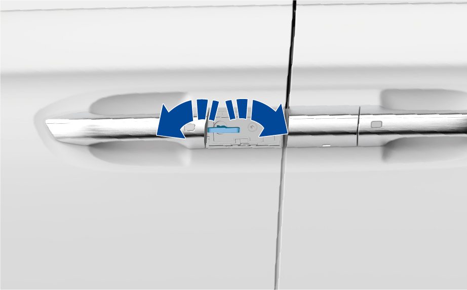 车辆退出 READY 模式后,关闭所有车门和电动后备箱,携带智能钥匙或蓝牙钥匙,按下前车门把手上的按钮,所有车门锁止,左右转向灯闪烁一次,喇叭鸣响一次,同时外后视镜自动折叠。