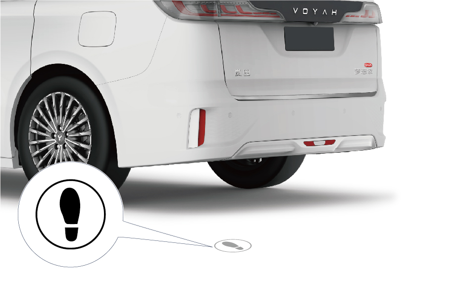 车辆静止或车速低于 5km/h 时,携带智能钥匙 / 蓝牙钥匙靠近车辆尾门识别区域,踩踏车尾处投影区域(如上图所示)并保持,投影灯闪烁 2 次后,电动尾门开启;再次踩踏该区域并保持,电动尾门关闭。