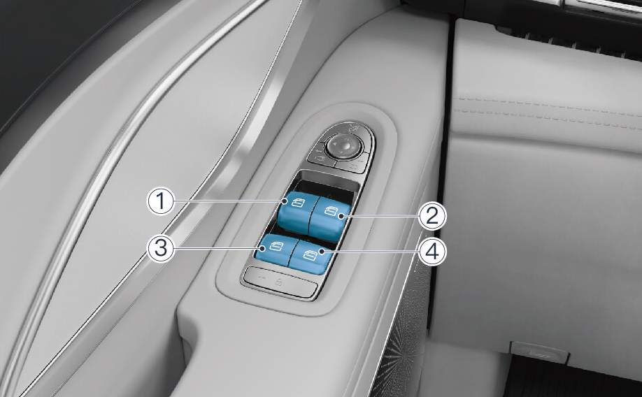 按下左前主驾车窗控制按键 ①,车窗下降,提起按键,车窗上升。用力按下 / 提起按键可触发车窗一键升降模式,车窗将自动下降 / 上升至完全开启 / 关闭。在车窗运行过程中,反向操作按键可以随时停止车窗运行。