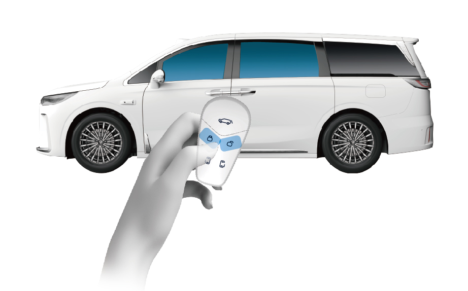 离车并关闭所有车门,长按智能钥匙锁止 / 解锁按键,可控制四门车窗玻璃自动上升 / 下降。