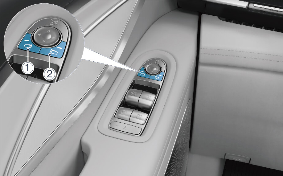 - 按下按键 ①,按前部圆形按钮前、后、左、右方向按键,可调节左侧外后视镜至合适的后视角度。