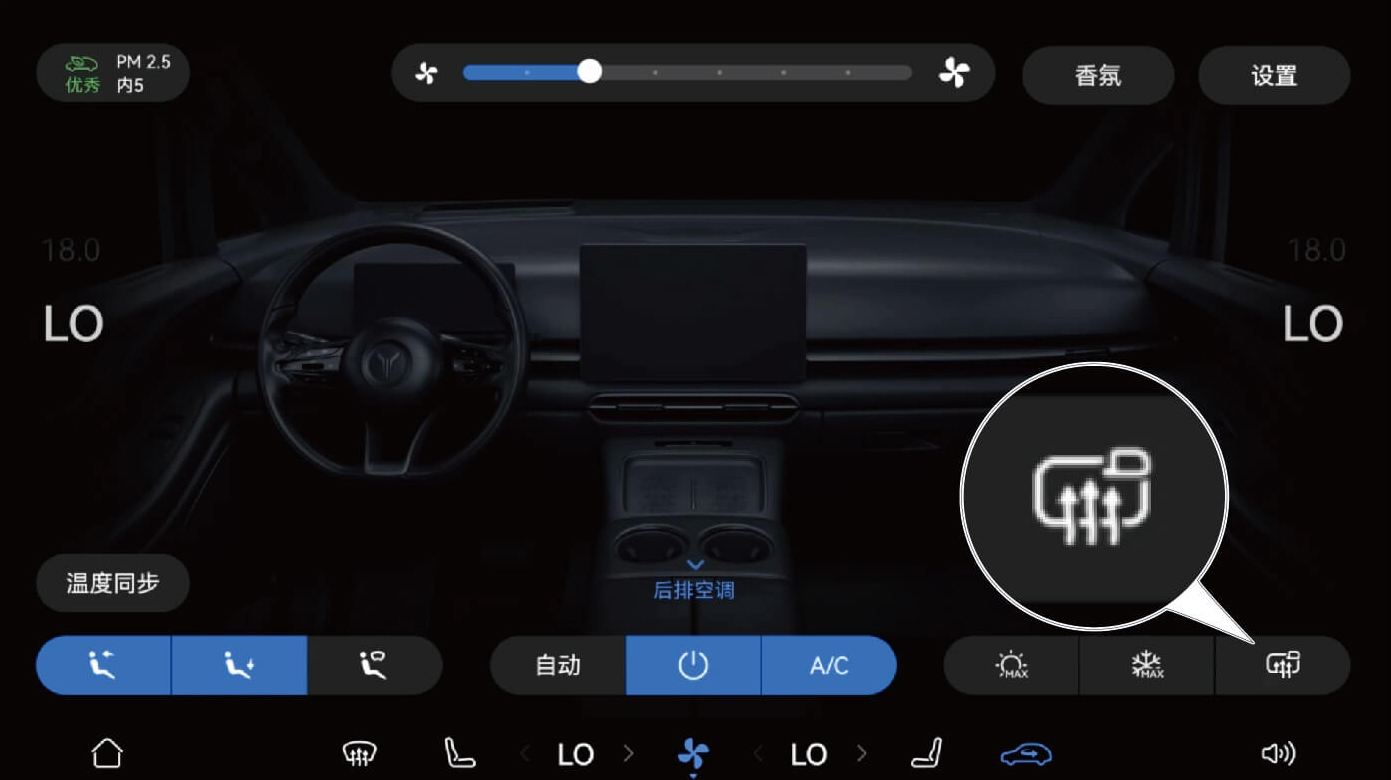 在中控屏空调界面,点触 按键,按键指示灯点亮,开启加热功能,可清除外后视镜与后挡风玻璃上的雾气或冰霜,再次点触该按键,关闭加热功能,按键指示灯熄灭。