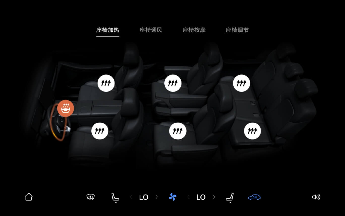 在中控屏底部工具栏 > 座椅 > 座椅加热界面,点触方向盘加热按键,按键灯点亮,加热功能开启;再次点触该按键,按键灯熄灭,加热功能关闭。