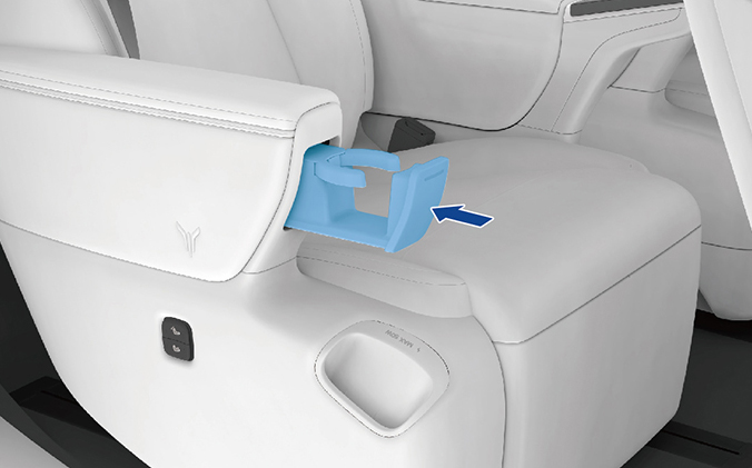 第二排杯座,位于二排座椅外侧扶手内,按压杯架盖板,杯架弹出,可放置水杯或饮料瓶。