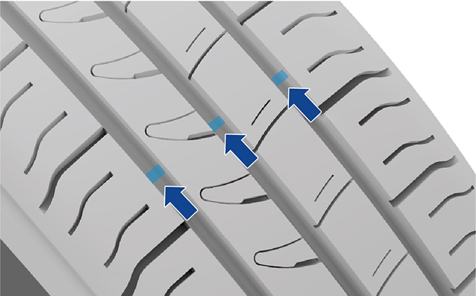 上图箭头为胎面磨损标记,用于指示轮胎胎面花纹磨损情况。如果胎面花纹磨损到标记位置,轮胎将无法继续使用,必须及时更换。
