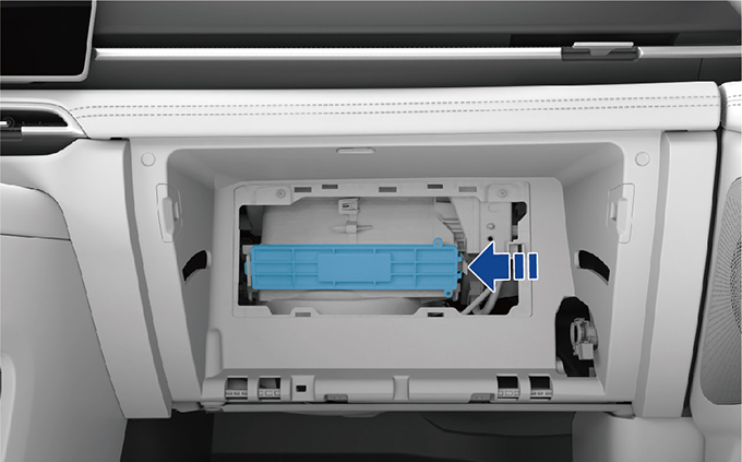 - 按压空调滤清器护盖右侧固定卡扣,取出空调滤清器护盖;