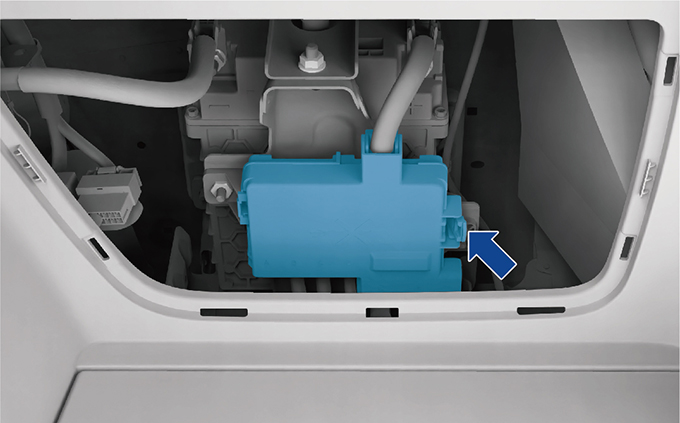 - 沿上图箭头方向按压固定卡扣,打开保险盒盖;