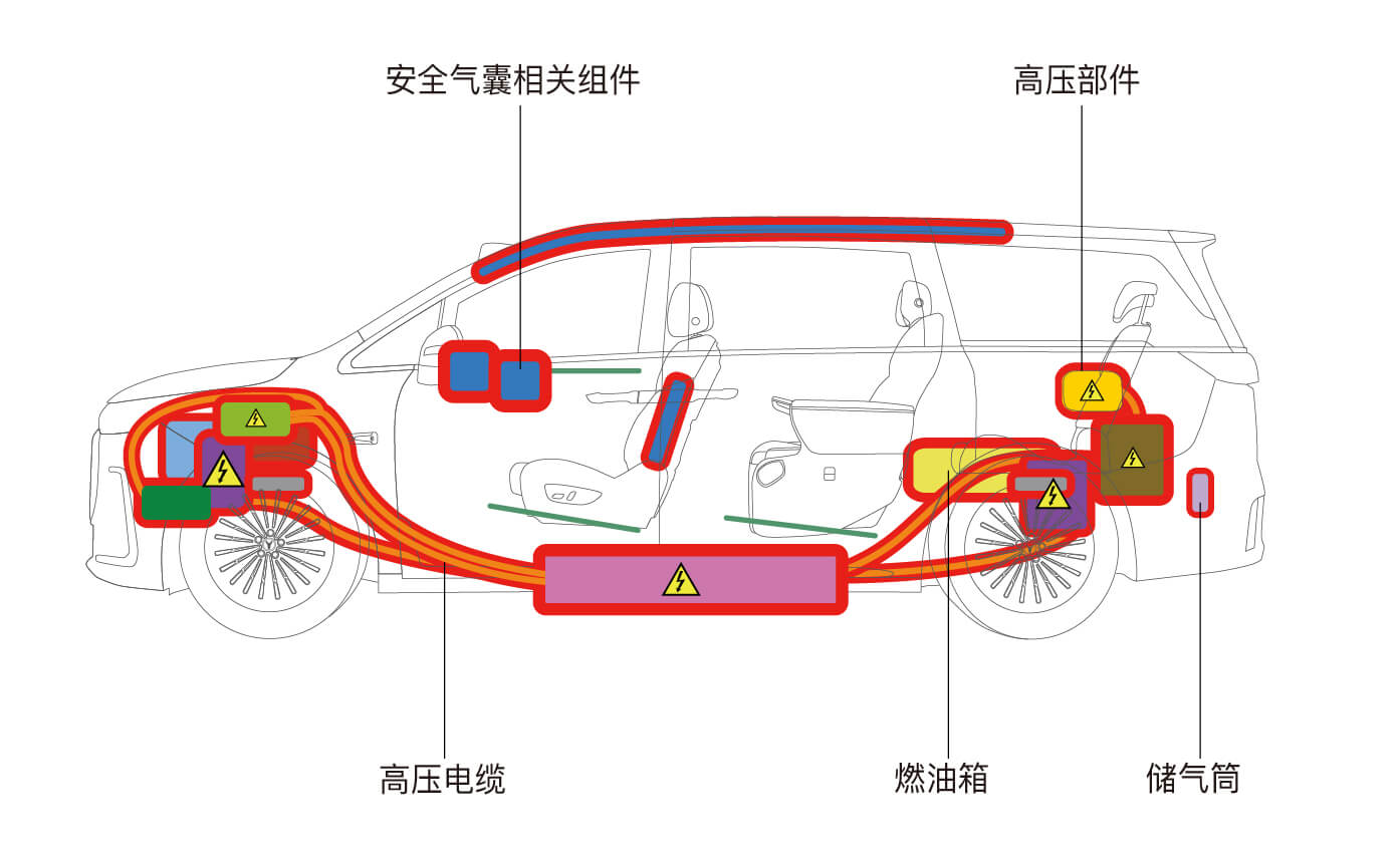 车辆高温、高压区域为禁止切割区域,如安全气囊相关组件、高电压部件、空气悬架储气筒*等。其他部位如需切割,救援人员应穿戴专业防护装备,选用合适的切割设备进行切割操作。