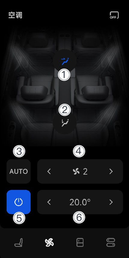 | ⑥ 开关空调 | 开启或关闭后排空调。 |