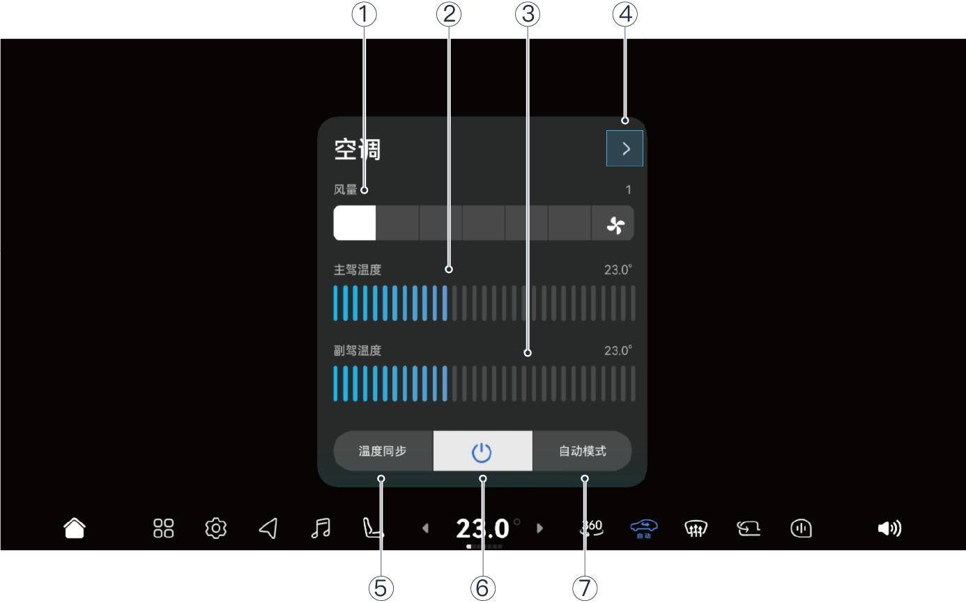 | ⑦ 温度同步 | 点触可开启或关闭“温度同步”,开启后,副驾温度将同步主驾温度。 |