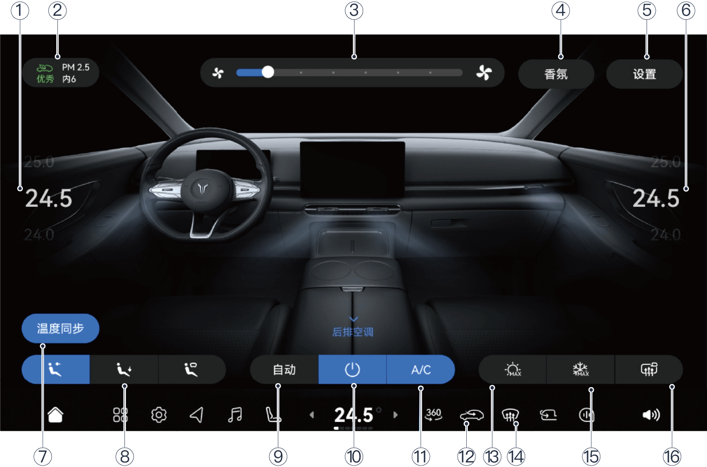 | ② 主驾温度 | 左右滑动或者点击档位调节主驾侧温度。 |