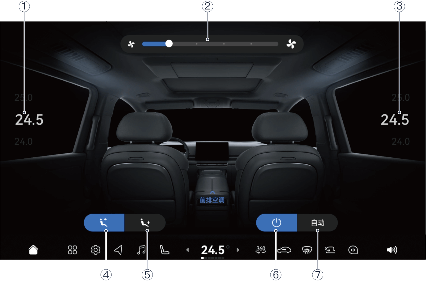 | ① 风量 | 风量调节,左右滑动或点击档位调节主驾风量,支持 1-7 挡风量调节。 |