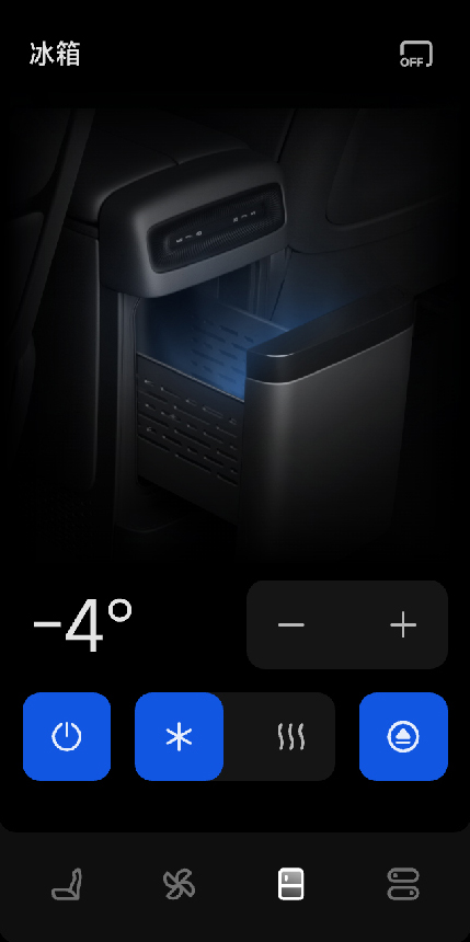 在中控屏设置 > 车辆控制 > 车内设备界面,设置开启 / 关闭冷暖箱电源,冷暖箱电源开启后,可设置冷暖箱以下功能: