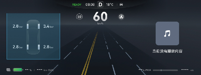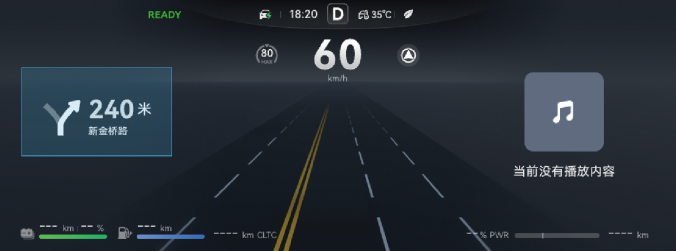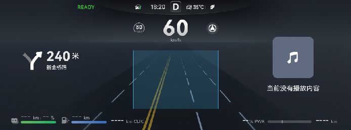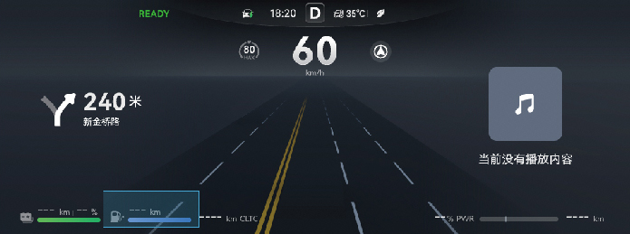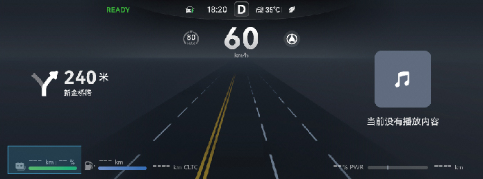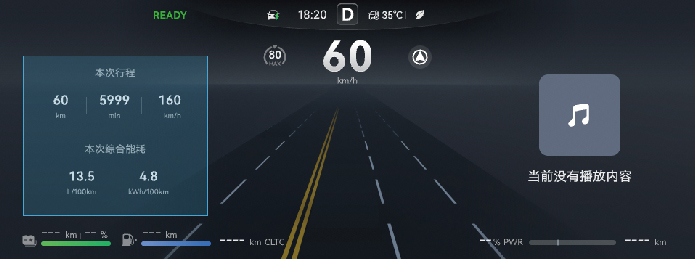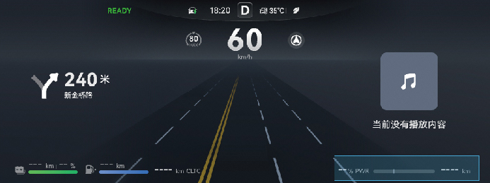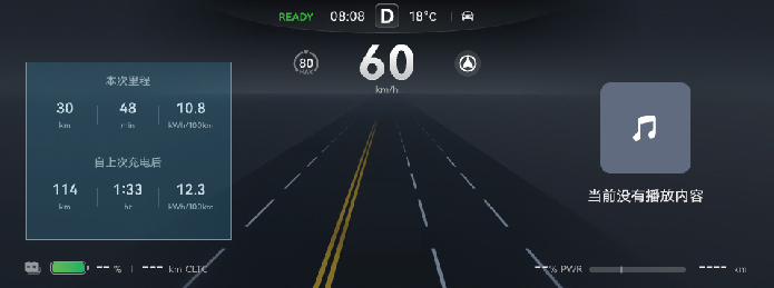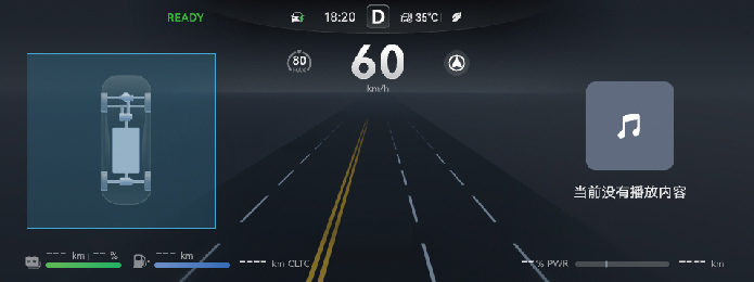 电源状态在 READY 模式下,整车行驶时,仪表根据整车功率信号实时显示当前功率和制动能量回收功率。