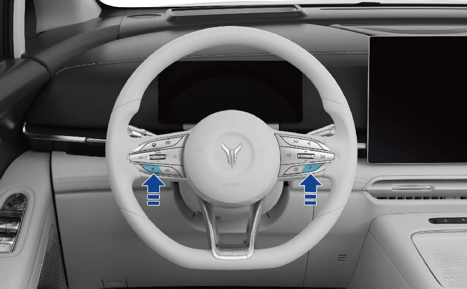 如果中控屏无响应或出现异常,可将车辆停放至安全地点,挡位切换至 P 挡后,同时长按方向盘左侧的自定义按键和方向盘右侧的电话按键 8 秒直至中控屏黑屏,重启中控屏。