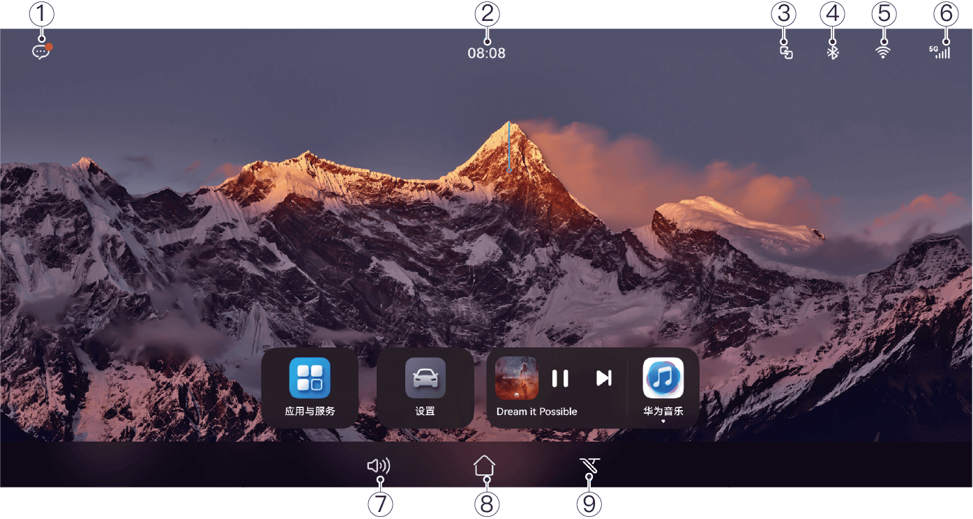 | ① | 通知 | 点触进入通知中心,可查看应用消息。 |
