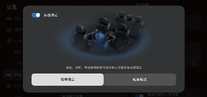 - 私享模式:除提示音外,其他声音仅为头枕音响播放,这样既不影响乘客休息,驾驶员也可以正常听音乐或导航。