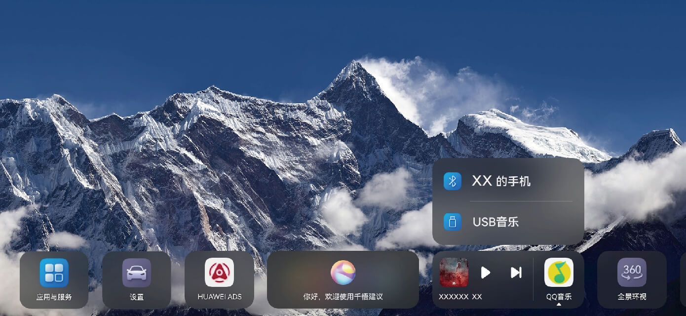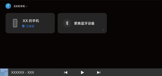 - 连接后,在中控屏底部快捷栏,点触音频卡片右侧图标,将播放音源切换至已蓝牙连接的手机名称。此时在手机上开启音乐应用并播放,声音将从座舱音响中发出。