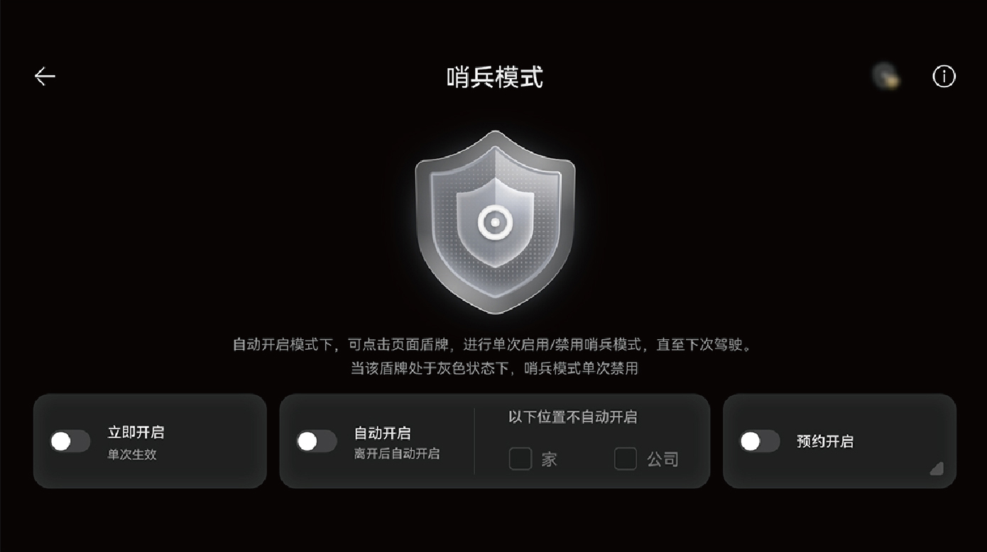 - 自动开启:启用后,车辆会在驾驶员离开车辆并锁车时,约 1 分钟内自动开启哨兵模式,驾驶员无需每次手动开启。若车辆中控屏中已经设置了“家”、“公司”两个常用地点的地址,则驾驶员还可以设置在这两个位置不自动开启哨兵模式,以减少电量与车辆组件寿命消耗。