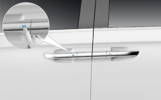 车辆闭锁状态下,携带智能钥匙或蓝牙钥匙,按下前车门把手上的按钮(上图所示),所有车门解锁,拉动门把手可打开车门。