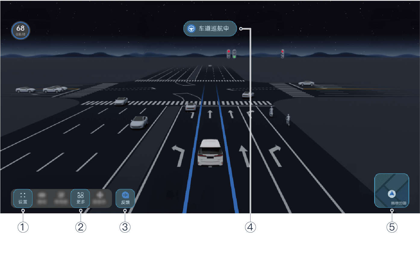 | ④ | ADS 状态岛 | 辅助驾驶运行过程中的提示卡片,显示辅助驾驶状态变化、辅助驾驶意图等信息。 |