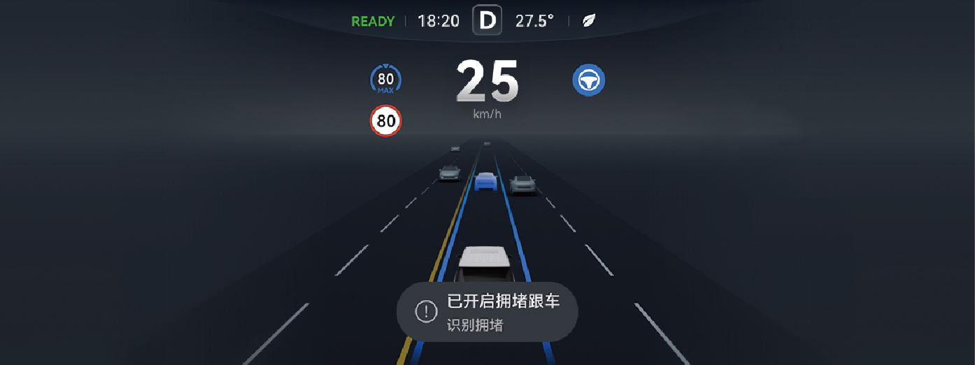 进入拥堵跟车模式时,组合仪表上会显示“已开启拥堵跟车”的提示。该提示会在显示数秒后消失。