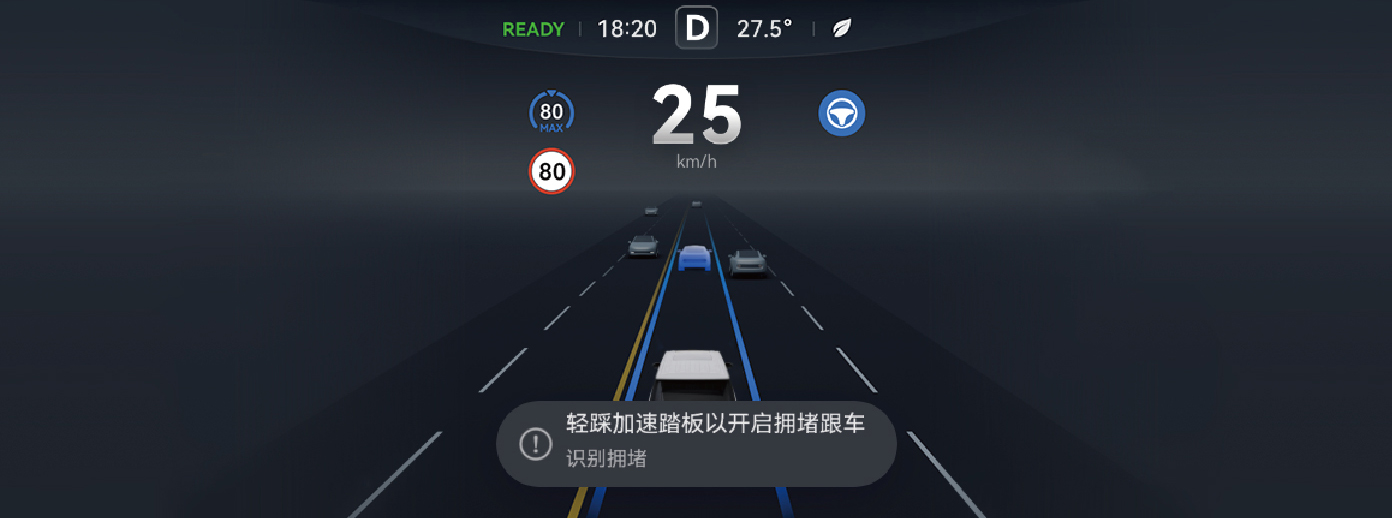 驾驶员将跟车时距调为 1 挡,车辆会在车速 < 30 km/h 且路况拥堵时进入拥堵跟车模式。