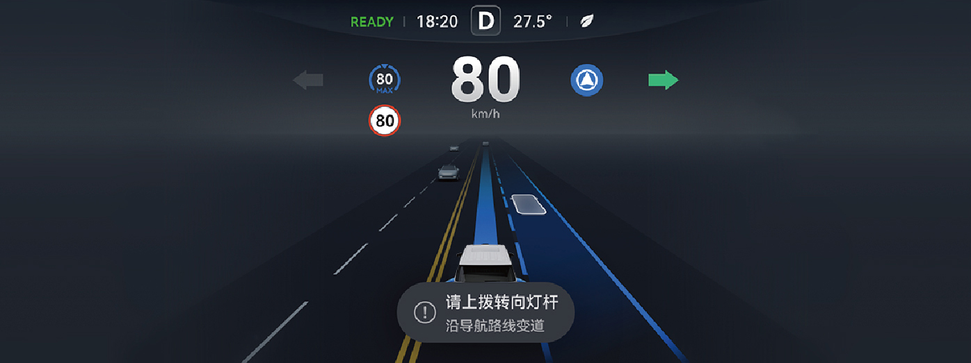 变道时,组合仪表上目标车道和车道线会蓝色高亮,车辆的目标位置显示为白色矩形。