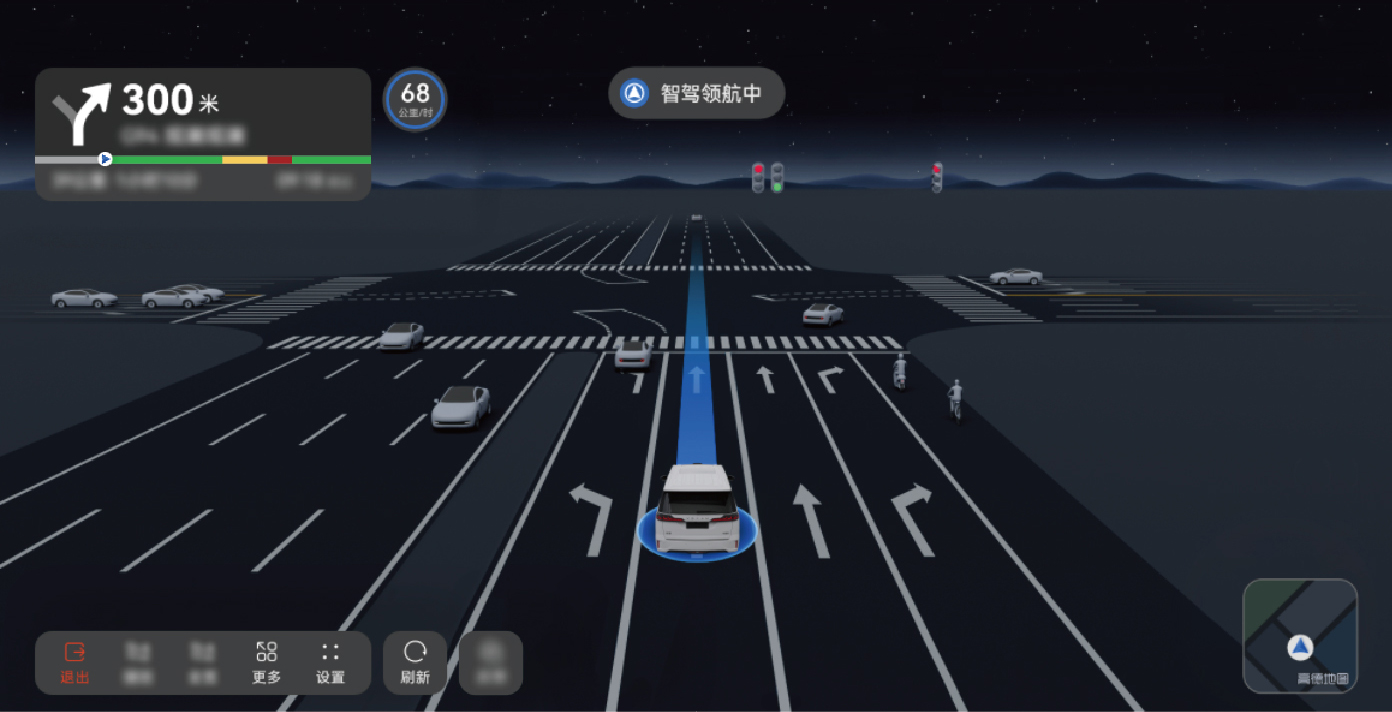 - 在中控屏上,点触 ADS APP 上的 ADS 状态岛卡片(即下图中“智驾领航中”字样所在卡片)。点触后,若车辆可以切换至 LCC,则 ADS 状态岛会显示“已降至车道巡航”的文字提示,数秒后消失。