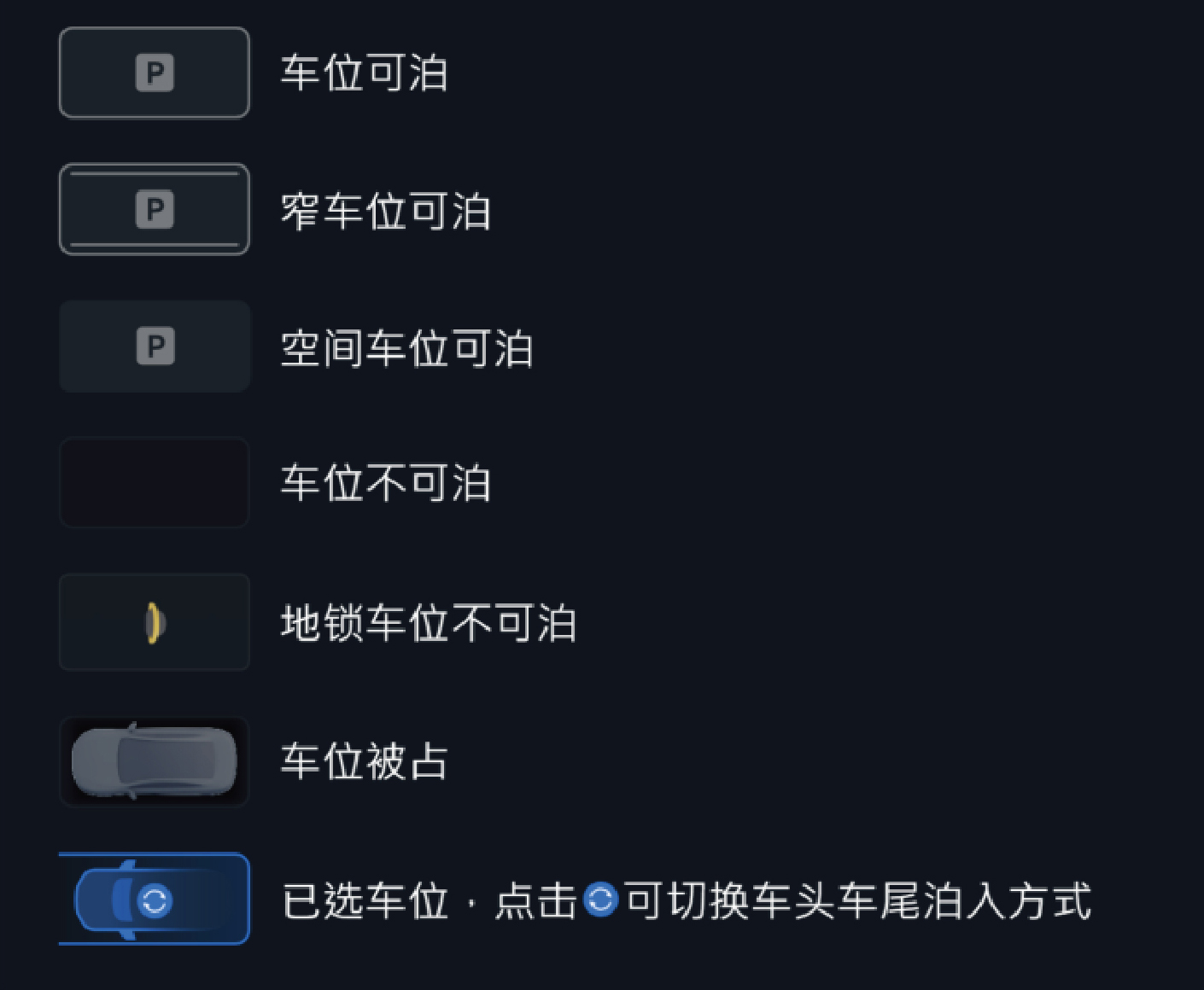 选择车位时,若车位框出现 图标,则驾驶员可点触该图标切换车头车尾泊入。否则表明当前车位不支持切换泊入方式。