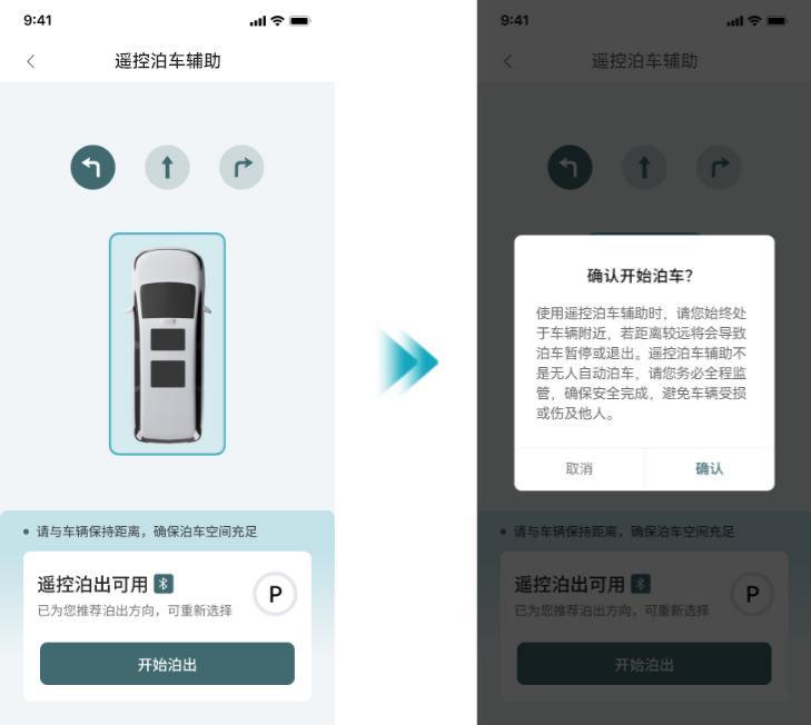 在手机界面点触“遥控泊车辅助”,待系统完成自检后,选择泊出方向,再点触“开始泊出”并确认,一键控制车辆泊出车位。