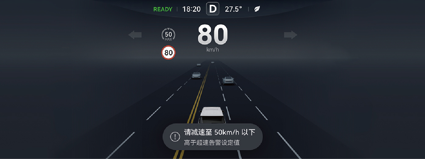在车速超过设定的告警阈值时发出告警,提醒驾驶员以合理的速度驾驶。使用 NCA 时本功能不生效。