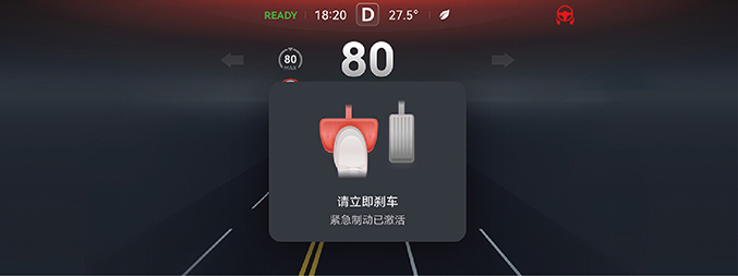 - 发生 AEB 后,驾驶员应立即采取措施,避免车辆陷入进一步的危险中,避免因紧急制动导致其他事故或伤害。例如,对于确实有碰撞风险的场景,驾驶员应及时踩制动踏板确保制动;对于不必要的制动,驾驶员可以通过快速踩下加速踏板、转动方向盘或松开加速踏板后再次踩下加速踏板的方式来中断制动。