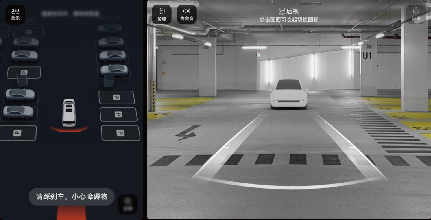 实施 RAEB 时,中控屏上会在自车后方显示动态红色弧线,并将风险目标红色高亮显示,伴有“请踩刹车”的文字提示,提醒驾驶员采取制动措施。