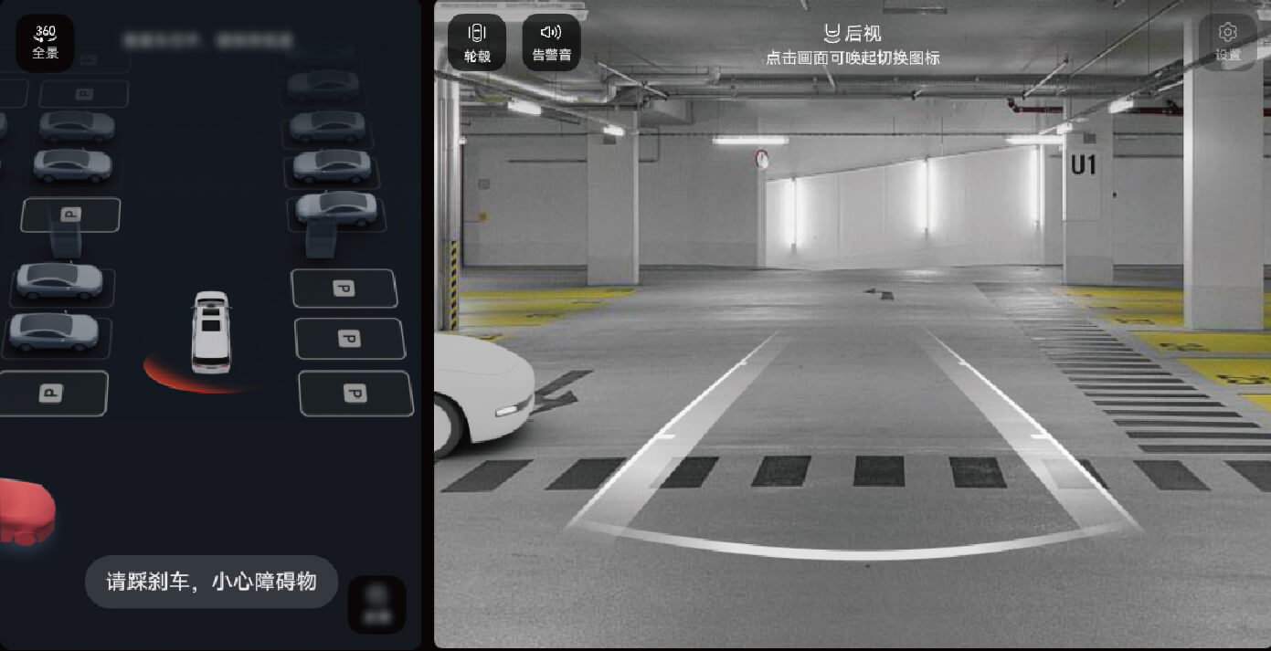实施 RCTB 时,中控屏上会在自车侧后方来车方向显示动态红色弧线,并将风险目标红色高亮显示,伴有“请踩刹车”的文字提示,提醒驾驶员采取制动措施。