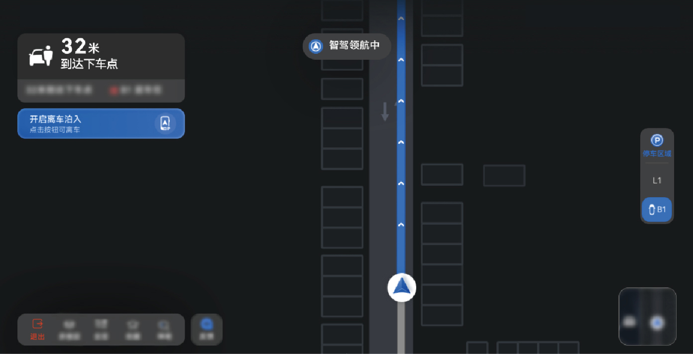 - 驾驶员首次驶入支持 VPD 的地下停车场,若未观察到“开启离车泊入”提示卡片,可在中控屏界面选择一个目标车位,点触“去这里”发起导航后,也可观察到“开启离车泊入”提示卡片。此种情况下,若目标车位被占,车辆将在当前楼层中寻找其他可泊空车位。