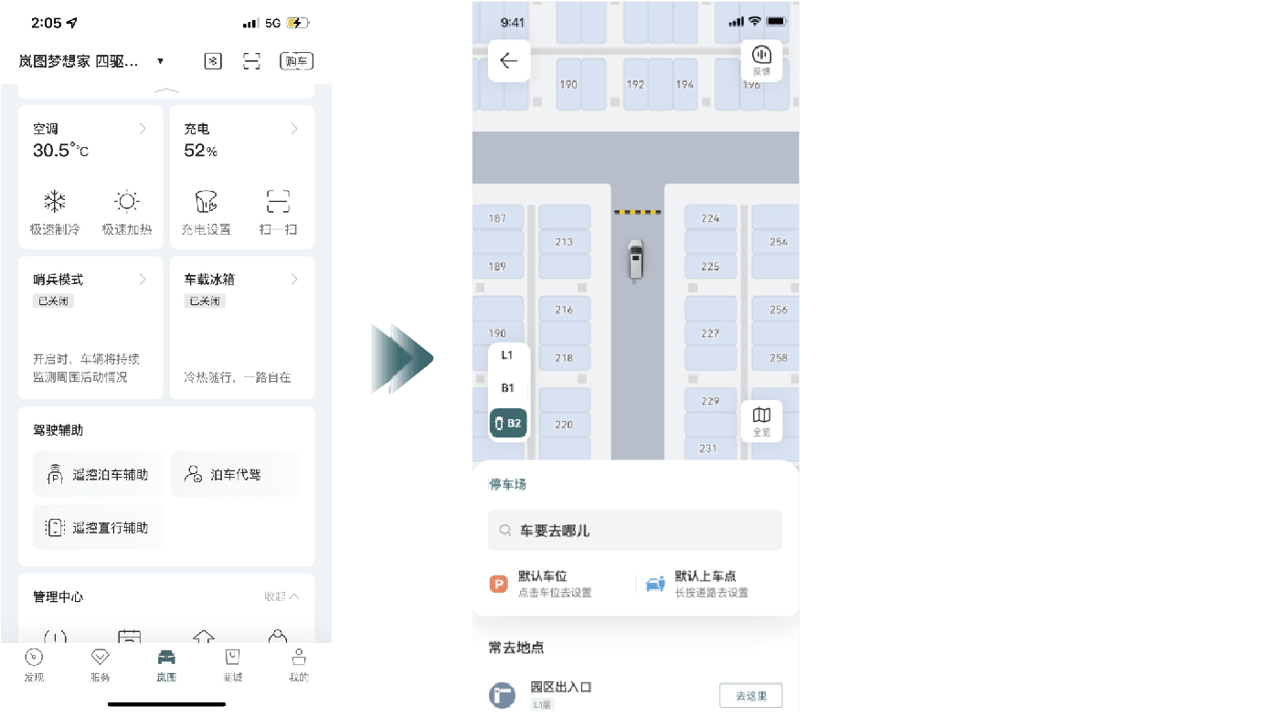 待系统完成泊车代驾条件自检后,手机岚图汽车 APP 显示当前停车场的平面图。