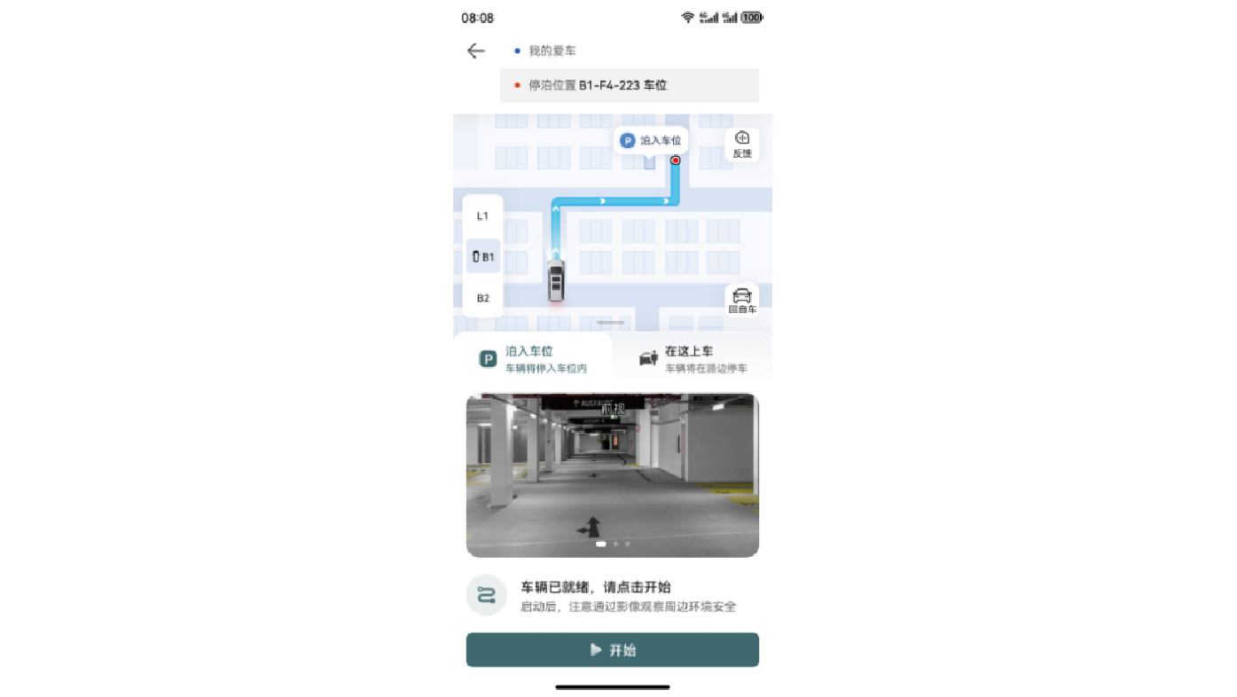 在“泊入车位”页签,点触“开始”,车辆将沿着系统规划的泊车路线行驶,并泊入目标车位。